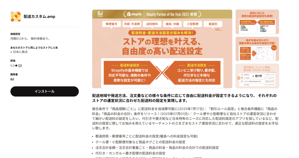 「配送カスタム.amp」は、配送地域・発送方法・注文量など様々な条件に応じて配送料金を自由に設定できる国産のShopifyアプリです。配送料の設定において細かなカスタマイズを行いたいストアや、特定の地域や発送方法に対応したいストアにおすすめです。