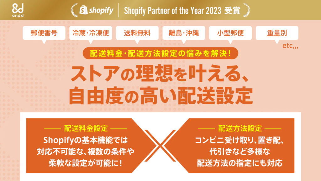 上記のように、Shopify担当者が配送について悩むあらゆるポイントに応えています。それぞれのストアの運営状況に合わせた適正な送料が設定でき、かつShopifyの標準機能として備わっている配送料金の設定条件のみならず、郵便番号や商品タグ・代引き・置き配など、日本特有のニーズに対応した配送料金の設定や細かい条件で配送料金の設定が可能です。