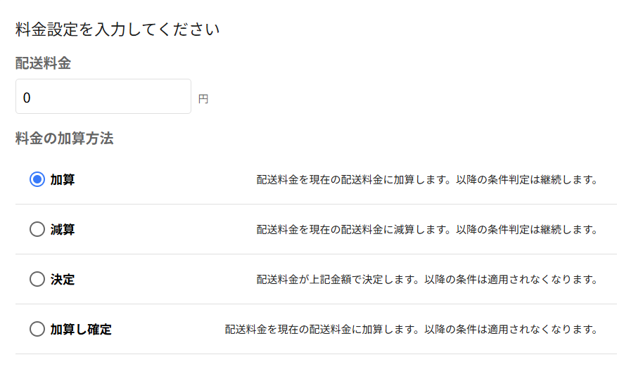 - 注文合計金額・注文合計重量ごと・商品の料金・商品の料金の合計での配送料設定
