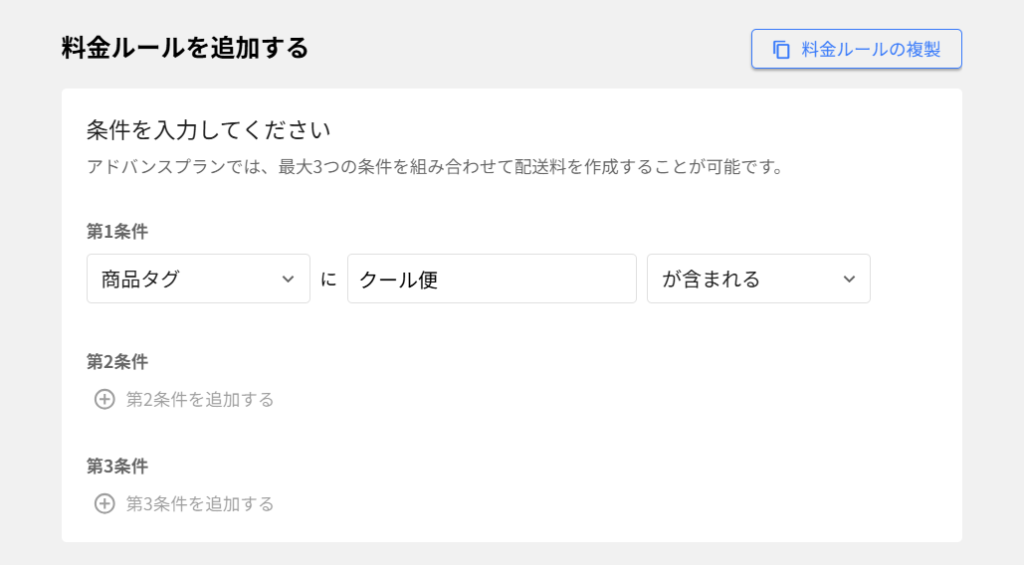 上記の図のように、商品タグが「クール便(任意入力)」であれば、配送料金を「◎◎円」加算することができる、といった統一設定を付与することができます。