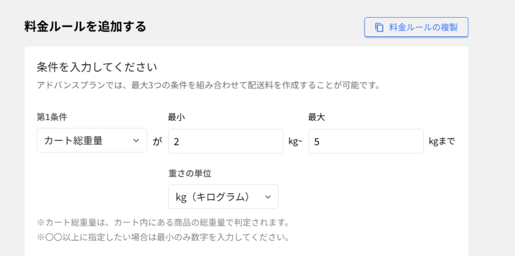 本アプリは、商品の重量・価格・配送先地域・購入数量など、さまざまな条件に基づいて配送料を設定することができます。具体例を挙げると、重量が一定以上の商品には追加料金を設定する、また特定の地域への配送には地域別の料金を適用するなどが可能です。