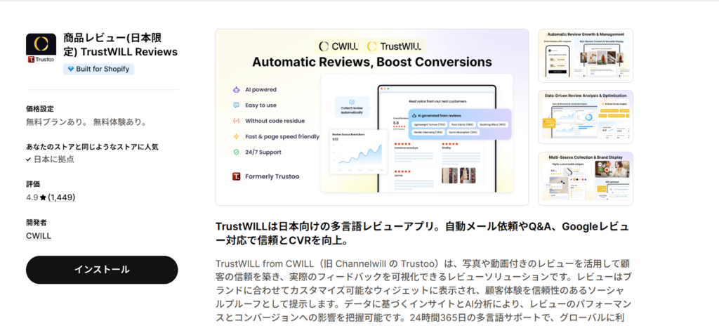 | 商品レビュー(日本限定) TrustWILL Reviews | 写真や動画を活用したレビュー | 無料~ | 日本市場向けの最適化が進んでおり、美しいデザインでの利用ができるため |