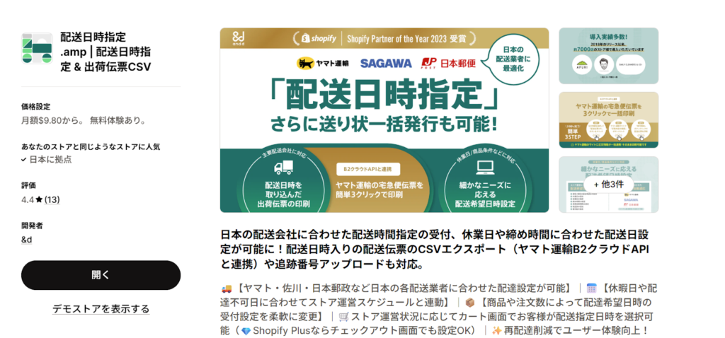 | 配送カスタム.amp | 複雑な条件下での送料設定、条件別設定 | $12/月~ | 配送エリアごとの料金差を正確に反映し、トラブルを防ぐ |