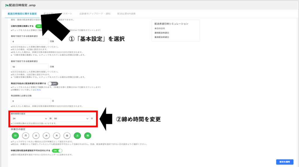 ・最短・最長希望日、締め時間、休業日設定|ストア運営スケジュールに合わせて配送希望日を制御