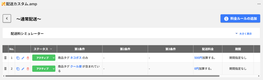 この方法だと、料金ルールNoが上位のルールから優先的に適用される仕様のため、1つでも通常配送タグがある場合はそちらの料金が適用されます。
