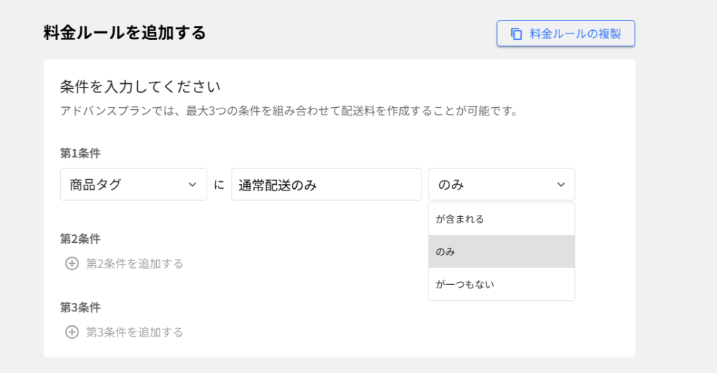 アドバンスプランでは、商品タグ設定の際に商品タグが「含まれる」「のみ」「1つもない」から選択可能で、そこからさらに柔軟な設定ができます。