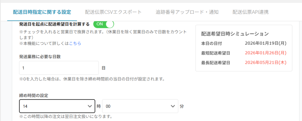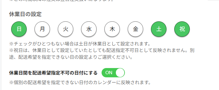どんなに締め時間を設定していても、店舗自体が休みであれば発送はできません。休業日の設定は必ず行いましょう。
