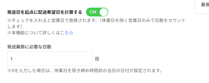 締め時間内に注文されたとして、「発送業務に必要な日数」の欄から、お届けまでに何日かかるかを設定します。