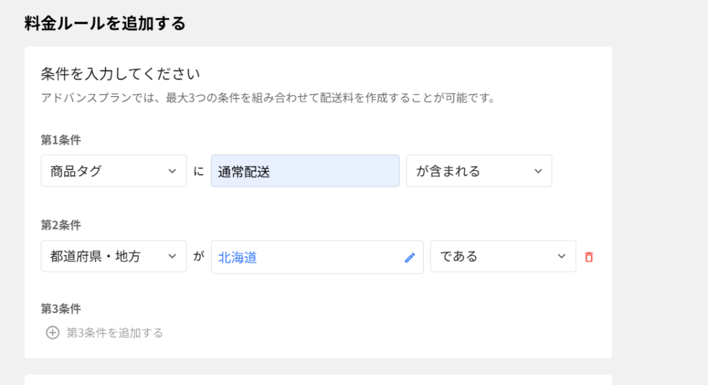 次に第1条件で商品タグ「通常配送」を含み、第2条件で「配送先が北海道地方」に設定します。第2条件で「都道府県・地方が北海道である」を設定してください。