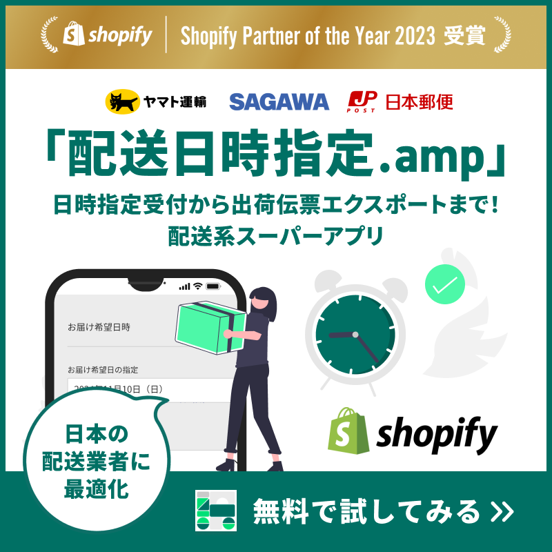 「配送日時指定.amp」は、日本の主要な配送業者に合わせて、購入者が商品購入時に配送日や配送時間帯を指定可能にするアプリです。配送日時指定ができるShopifyアプリの中でも人気の高いアプリで、日本での累計インストール数は10,000件を超えています。日本の配送業者に合わせた配送日時指定ができる機能を導入したいストアや、配送スケジュールのカスタマイズを行いたいストアにおすすめです。