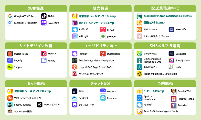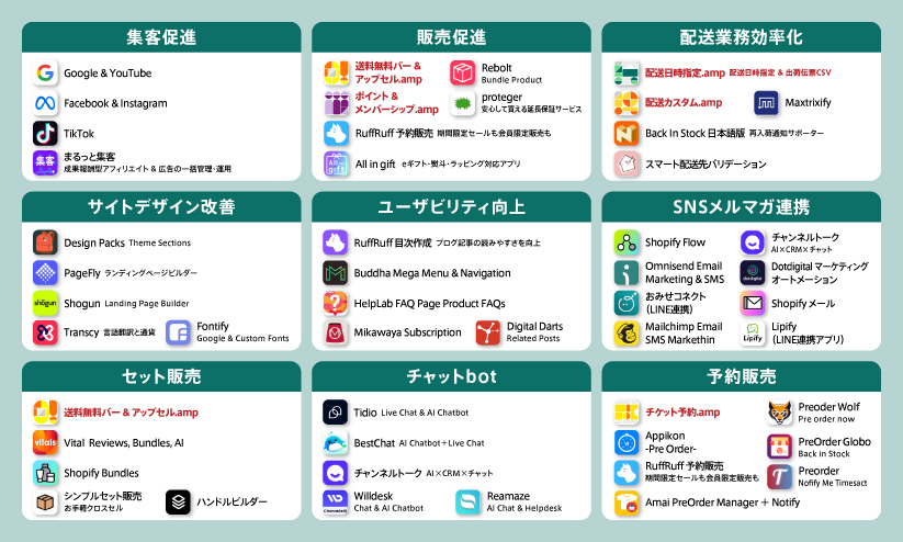 本章では、おすすめのアプリを「配送業務効率化」「集客促進」「販売促進」「予約販売」「サイトデザイン改善」「ユーザビリティ向上」「LINE連携」「セット販売」「チャットボット」の観点からそれぞれ紹介します。下記情報を参考に、ストアの課題解決に役立つ最適なアプリを探してみてください。