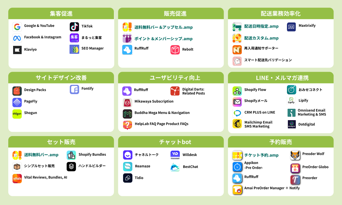 本章では、おすすめのアプリを「配送業務効率化」「集客促進」「販売促進」「予約販売」「サイトデザイン改善」「ユーザビリティ向上」「LINE連携」「セット販売」「チャットボット」の観点からそれぞれ紹介します。下記情報を参考に、ストアの課題解決に役立つ最適なアプリを探してみてください。