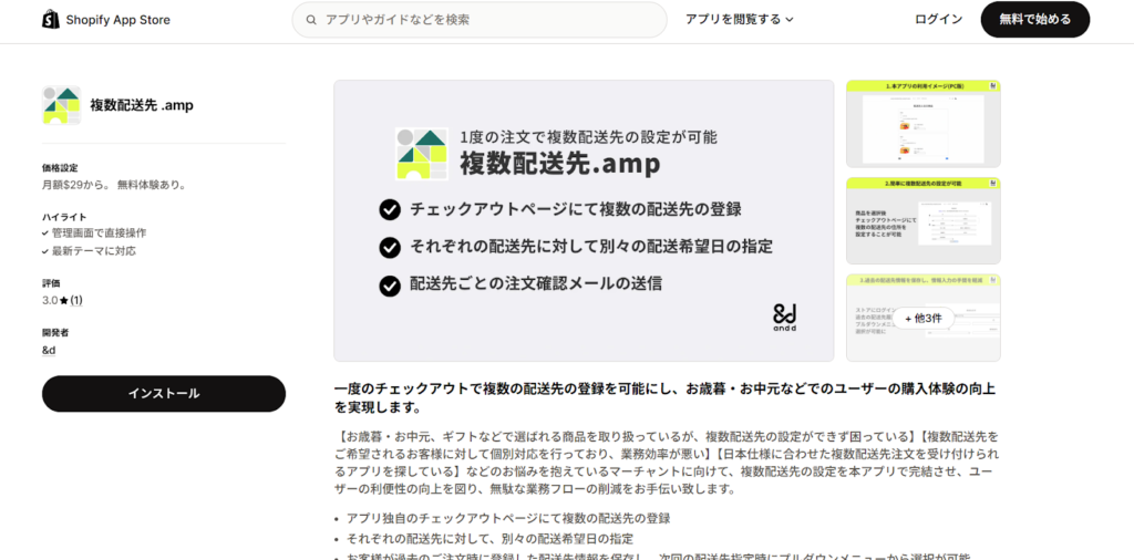 複数配送先.ampは、1回の注文で複数の配送先(マルチアドレス)を指定できるようにするShopifyアプリです。
