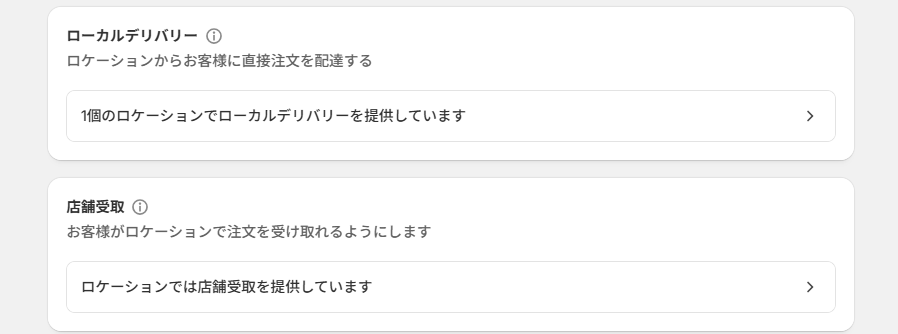Shopifyでは「ローカルデリバリー」と、「店舗受け取り」の2つの配送設定が可能です。