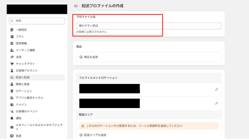 手順3:「配送プロファイルを管理する」という画面に遷移するので、名前の欄に新しく絞り込みたいエリアがわかるような名前を入力しましょう。